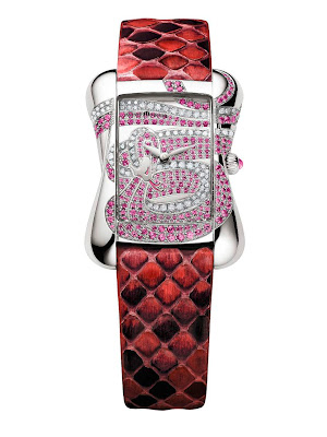 Sie fanden die Schlange - und was könnte das Feuer besser symbolisieren? Es schlängelt sich stilvoll, als wollte es das Weißgoldgehäuse der Divina Temptation schützen - nicht nur über die Zifferblatt- und Gehäusefront, sondern auch durch den schlanken Körper, der die gesamte Uhr umschließt, um den Fall zurück in dieses außergewöhnliche Kunstwerk zu integrieren. Edelsteine spiegeln die Farben und runden Formen der Schlange wider.